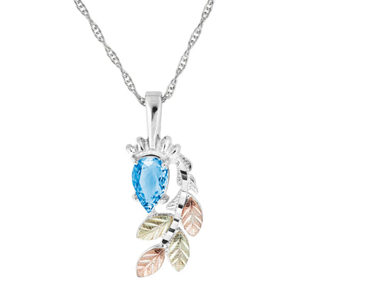 Black Hills Gold by TRJ This beautiful sterling silver pendant is adorned by a sparkling blue topaz stone. It features classic Black Hills Gold styling. All yellow gold components are 10K solid gold. All white gold...$ 119.00 -