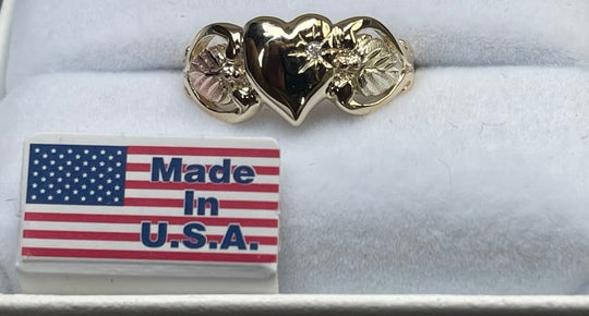 Mt Rushmore Black Hills Gold An elegant natural diamond and heart design adorns this ladies ring. It features classic Black Hills Gold styling. All yellow gold components are 10K solid gold. All white gold items are...$ 235.00 -