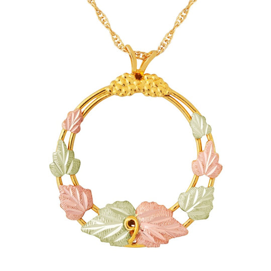 Landstrom's Black Hills Gold An elegant 10k gold circular pendant accented by grapes and the traditional Black Hills Gold 12kt rose and green leaves. It features classic Black Hills Gold styling. All yellow gold components are...$ 377.00 -