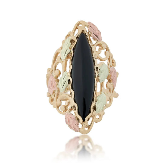 Landstrom's Black Hills Gold An elegant genuine onyx design adorns this ladies ring. It features classic Black Hills Gold styling. All yellow gold components are 10K solid gold. All white gold items are custom, non-refundable &...$ 1,060.00
