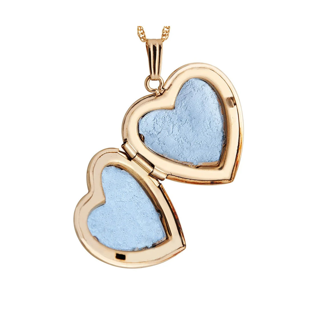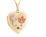 An elegant locket accented by a hummingbird and foliage. It features classic Black Hills Gold styling.