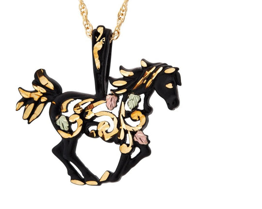 Landstrom's Black Hills Gold An elegant powder coated horse pendant accented by beautiful foliage. It features classic Black Hills Gold styling. All yellow gold components are 10K solid gold. All white gold items are custom, non-refundable...$ 166.00 -
