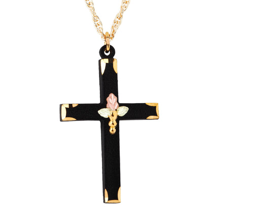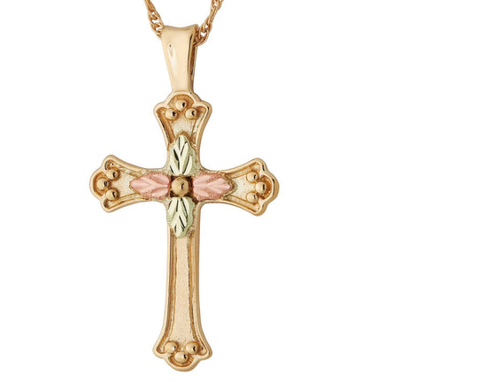 Mt Rushmore Black Hills Gold A beautiful 10k cross design graces this elegant pendant accented with 12kt gold rose and green leaves. It features classic Black Hills Gold styling. Add a 10K Gold Fine Necklace for...From $ 144.00 -