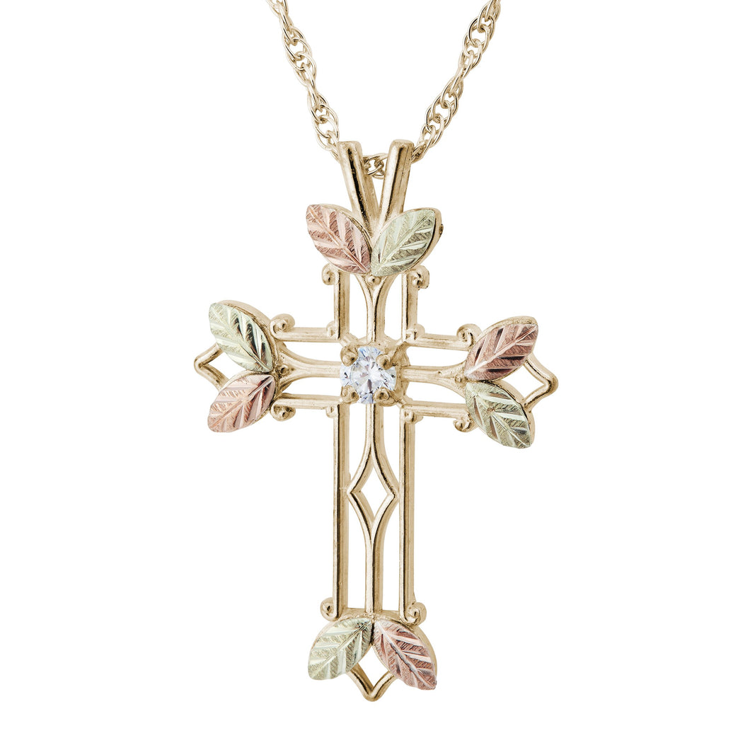 This beautiful 10k gold pendant features an intricate cross and tiny sparkling diamond. It features classic Black Hills Gold styling.
