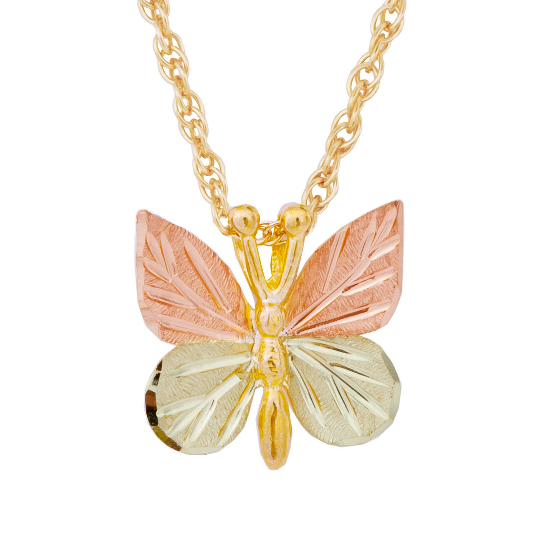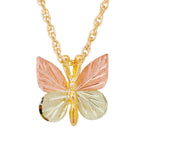 A beautiful 10k golden butterfly grace this elegant pendant accented with 12kt gold rose and green leaves. It features classic Black Hills Gold styling.