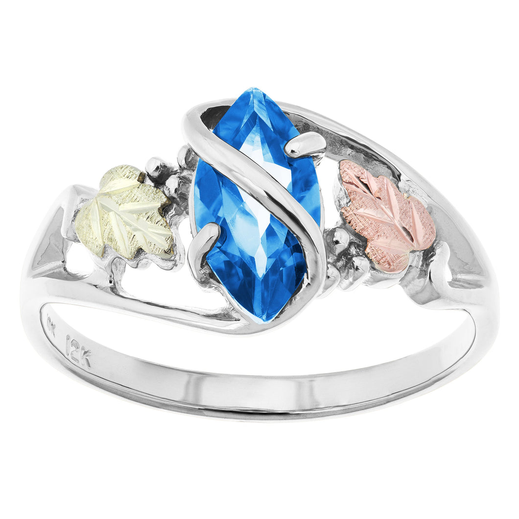 A brilliant blue topaz adorns this stylish sterling silver ladies ring. It features classic Black Hills Gold styling.