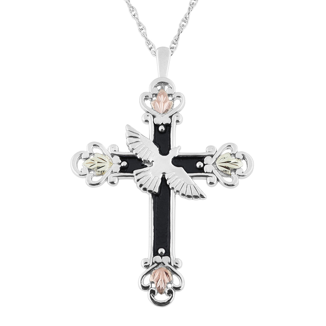 This beautiful sterling silver pendant is adorned by a dove and cross design. It features classic Black Hills Gold styling.