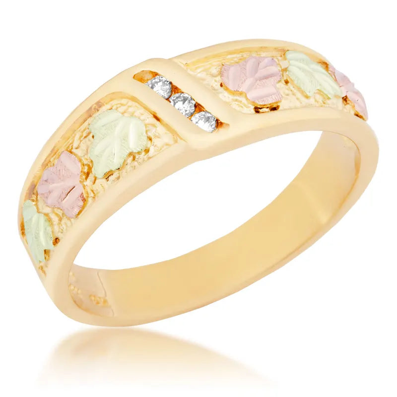 An elegant natural diamond design adorns this ladies ring. It features classic Black Hills Gold styling.