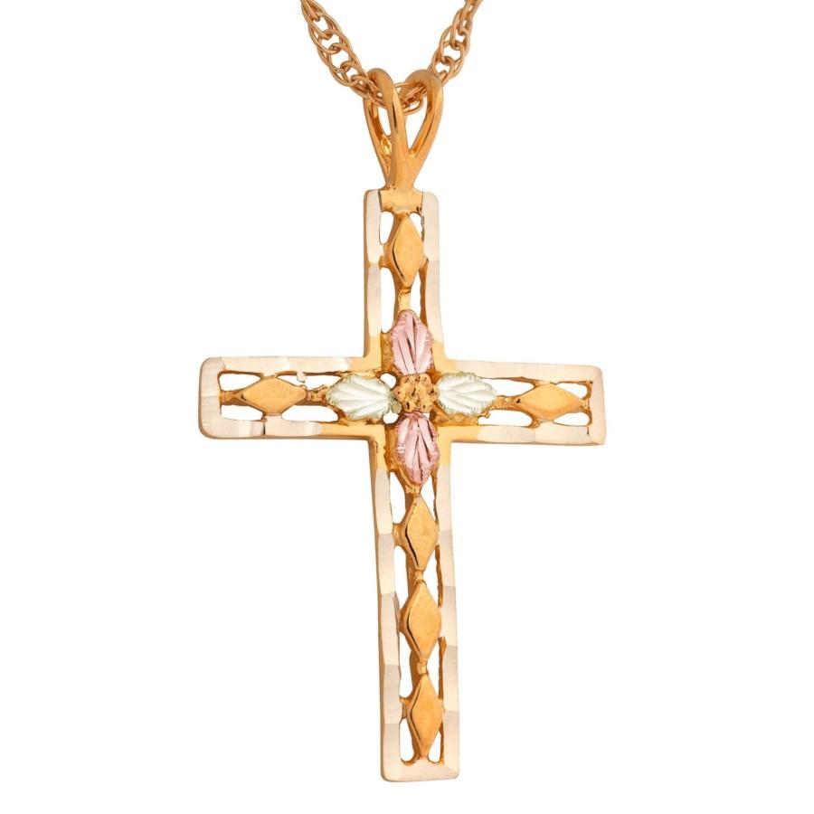 A unique cross, cross and foliage design adorns this elegant pendant.