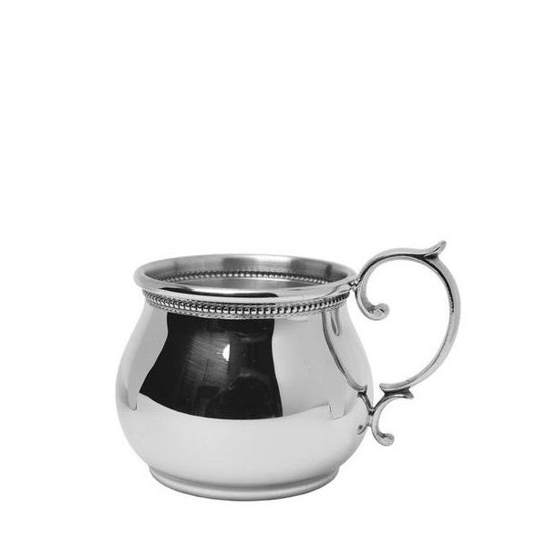 - Bulged Scroll Handled Baby Cup with Beading in Pewter