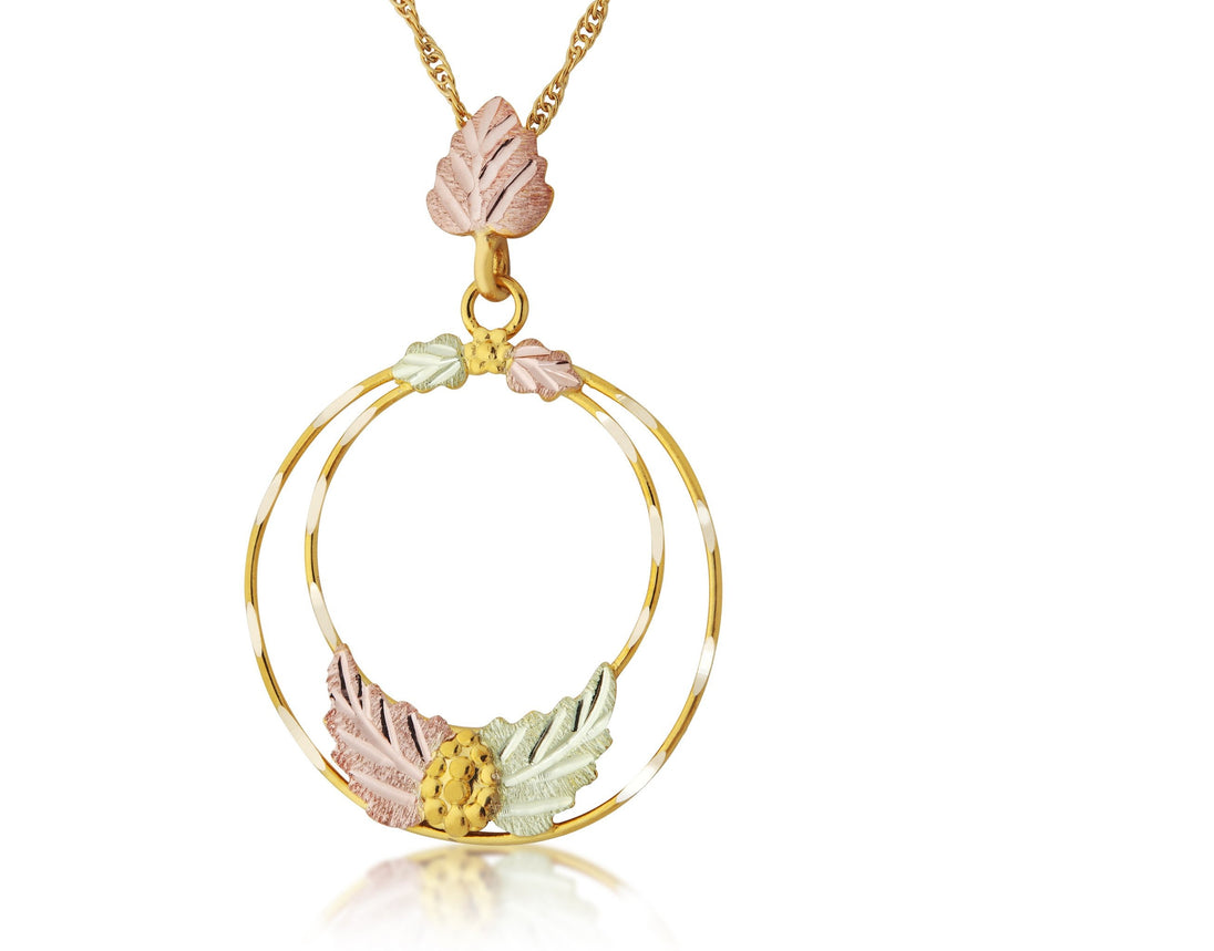 Beautiful 10k golden circles grace this elegant pendant accented with 12kt gold rose and green leaves. It features classic Black Hills Gold styling.