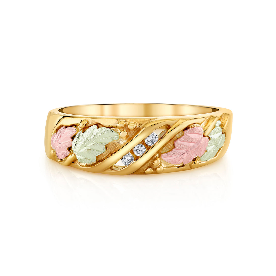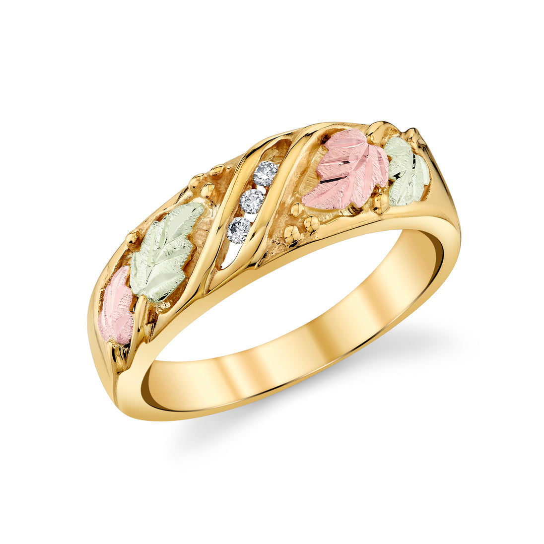 I purchased a 3 diamond men's black hills gold wedding ban. It was delivered within 3 days via usps. I lost my black hills gold wedding ring last year, this ring is the replacement for it. The new ring is a good looking ring, but you can hardly see the green and rose colored leafs. I am taking it to a jewelry dealer to have the open spaces filled in with black to make the detail stand out better, Other than the above I like the ring. After I get the work done I believe I will love the ring. The diamonds are not chips like some rings have, this diamonds are cut and have nice clarity.