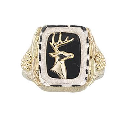 This sterling silver men's ring offers a stately buck design. It features classic Black Hills Gold styling.
