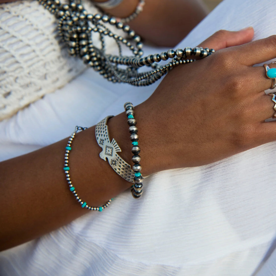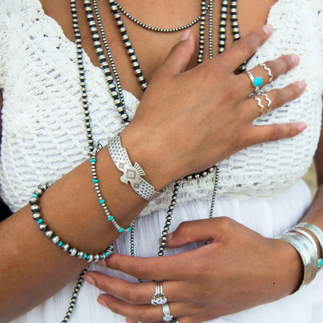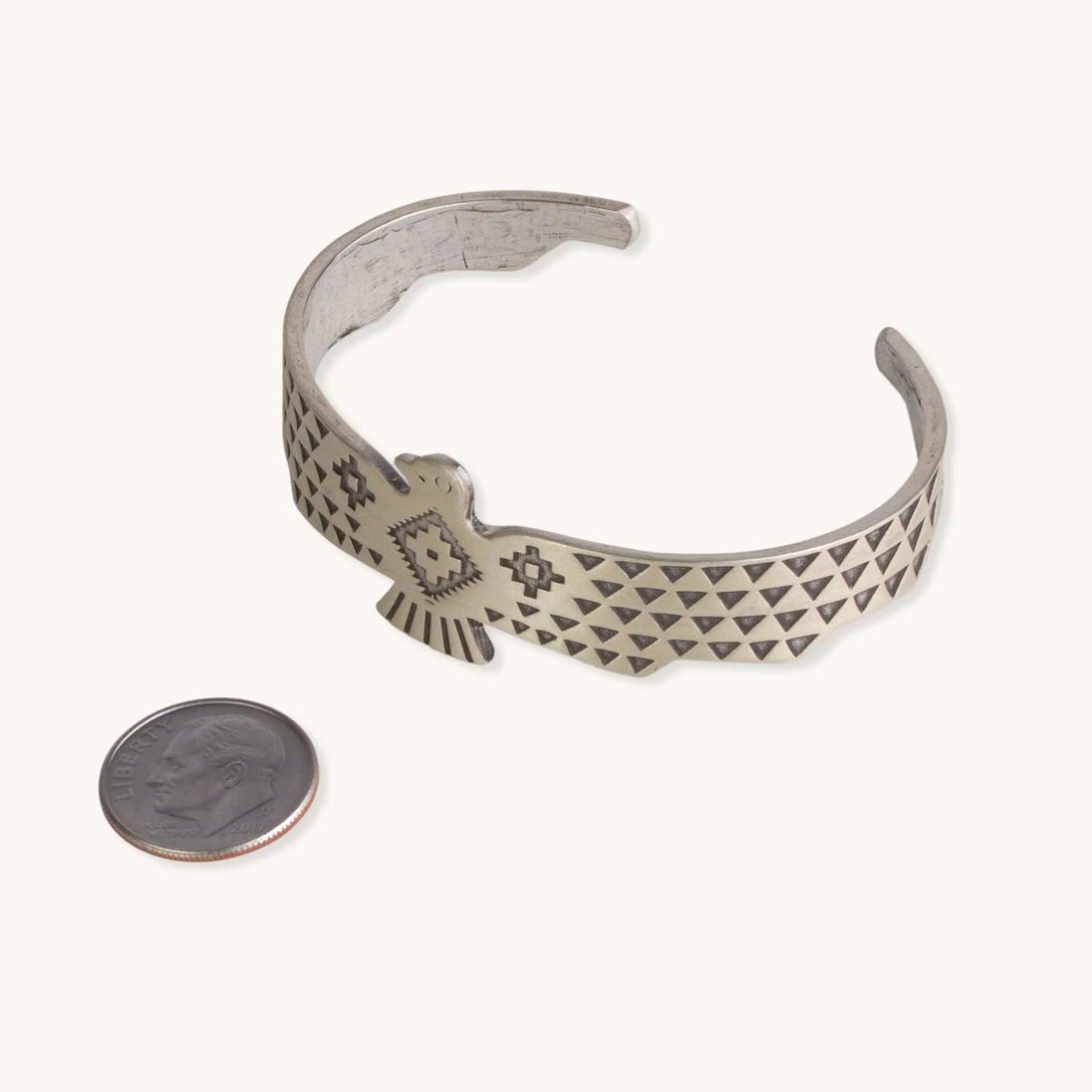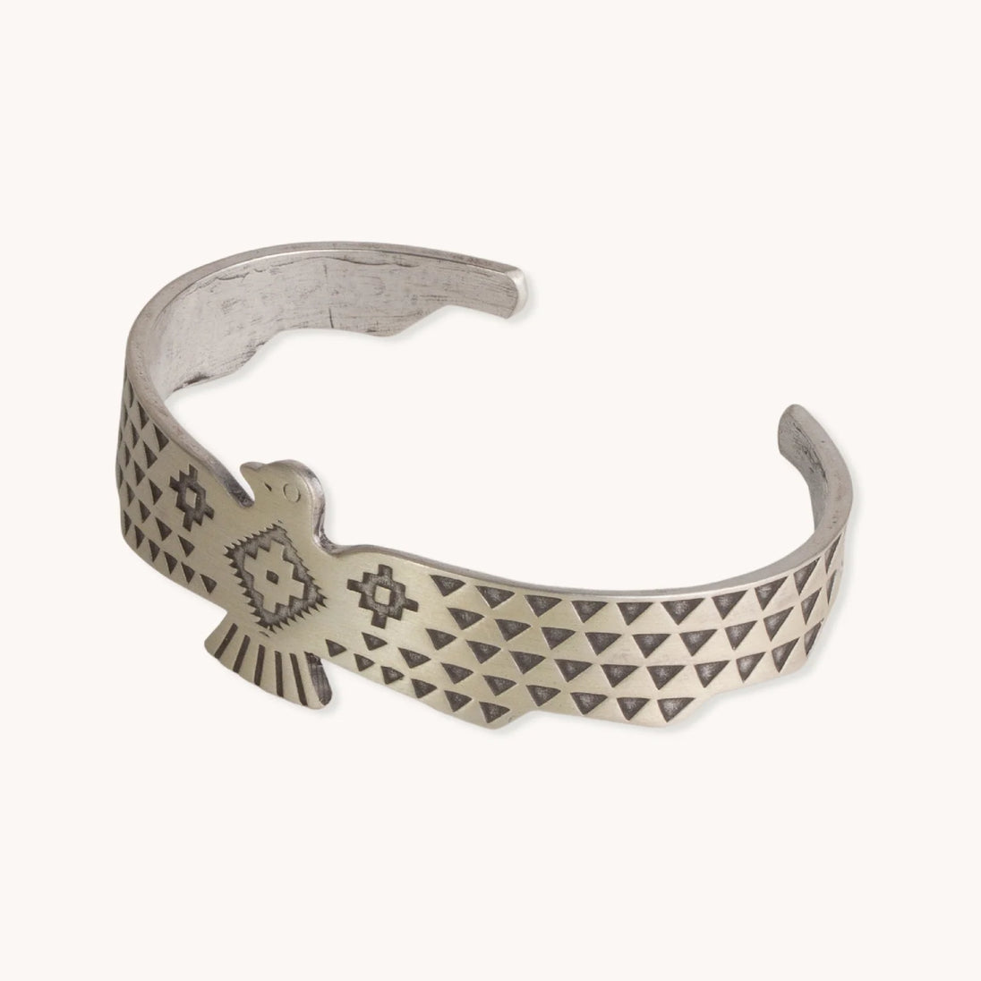 This stunning cuff bracelet is a unique piece of Native American handmade jewelry crafted by TSkies Artists of New Mexico. This SkyWeaver Thunderbird Rising Cuff Bracelet is a distinct accessory crafted from sterling silver. Its unique, Southwestern design features an elegant pattern and intricate detail, making it the perfect addition to any outfit. A stylish and timeless piece of jewelry.
