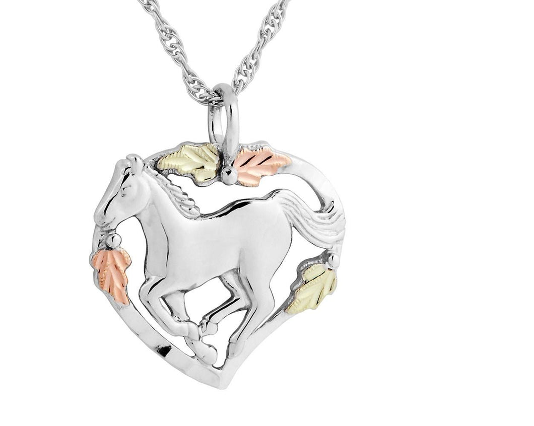 This beautiful sterling silver pendant is adorned by an elegant equestrian design. It features classic Black Hills Gold styling.